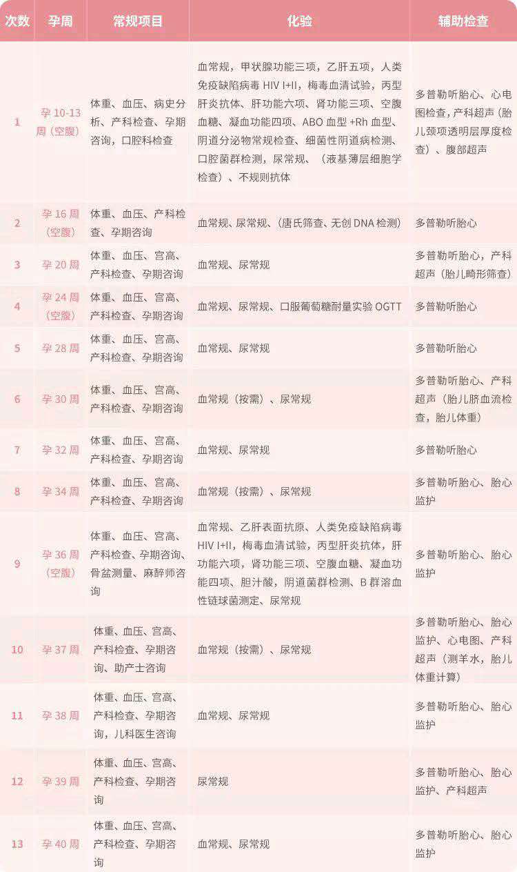 一般情況下,整個孕期準媽媽大約需要進行13次以上的產(chǎn)檢,每個時期關(guān)注的重點也是不一樣的。
